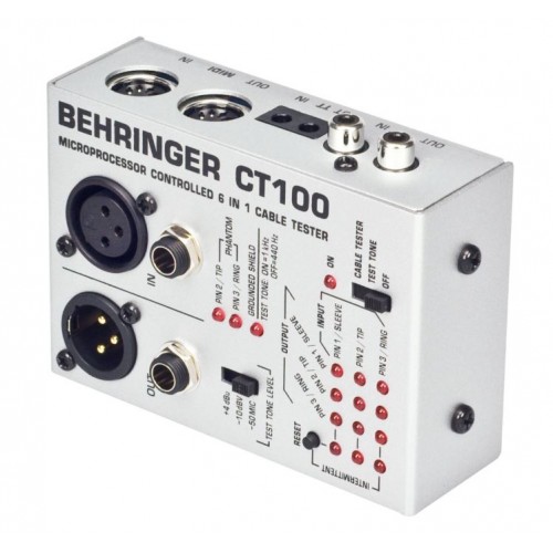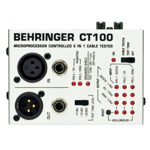«Интеллигентный» управляемый контроллером кабельный тестер CT100 позволяет проверить коммуникационные кабели практически с любым типом разъемов: XLR, монофонические и симметричные джеки (1/4, 1/8 и ТТ), RCA (тюльпан) и MIDI. Устройство показывает, какой контакт на входе соединен с каким контактом на выходе. Отдельные светодиоды показывают правильность заземления экрана и наличия фантомного питания. В CT100 предусмотрены также режим проверки кабеля в инсталляции, проверку прохождения сигнала и генератор тестового тона.