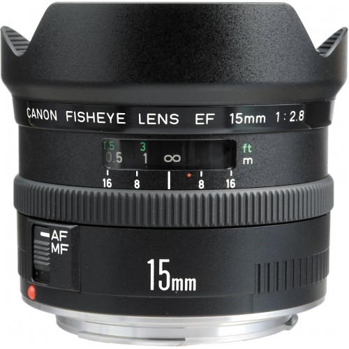 Canon EF 15mm f/2.8 Fisheye – ультраширокий объектив без исправления дисторсии (схема «Рыбий глаз») для пленочных и цифровых фотокамер Canon EOS. Обеспечивает обзор в 180 градусов по диагонали. На сегодняшний день это единственный «Фишай» для байонета Canon EF от самой Canon. Как и все фишаи, объектив выдает специфическое изображение с сильным искривлением и «закручиванием» по углам. Применяется для реализации различных эффектов в художественной фотосъемке. Кстати, при съемке чистого природного пейзажа эффект проявляется не так явно. Обладающий светосилой 2.8 этот объектив позволяет еще лучше и проще делать снимки в условиях плохого освещения без использования штатива или вспышки. Canon EF 15mm f/2.8 Fisheye выдает резкую картинку уже на диафрагме 2.8. С диафрагмы 4 – очень резкий. Встроенный мотор делает фокусировку достаточно быстрой, но, конечно, не такой быстрой и тихой, как в моделях с USM. Фокусировка – внутренняя. Выпуклая передняя линза не позволяет устанавливать светофильтры с резьбой. Можно ставить только желатиновые фильтры в хвостовую часть объектива. Красиво предает цвета, хорошо устойчив к контровому и боковому свету. Имеет небольшую встроенную лепестковую бленду. Объектив Canon EF 15mm f/2.8 Fisheye отлично подойдет для пейзажной, архитектурной, интерьерной и жанровой фотосъемки.