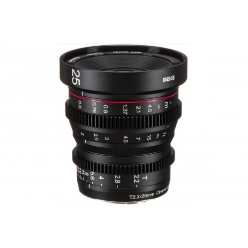 Кинообъектив начального уровня Meike 25 мм с ручной фокусировкой и светлой диафрагмой T2.2 является универсальным объективом, подходящим для современных беззеркальных камер с высоким разрешением. Объектив Meike Cinema Lens имеет шкалы фокусировки, отмеченные как в футах, так и в метрах с метками фокусировки и числа диафрагмы с обеих сторон объектива. Объектив также оснащен встроенными кольцами регулировки фокуса и диафрагмы с шагом 0.8мм имеет плавный ход вращения колец 270°. Максимальная диафрагма T2.2 позволяет работать в сложных условиях освещения и обеспечивает повышенный контроль над глубиной резкости. Высококачественное оптическое стекло и многослойное покрытие также способствует уменьшению бликов и повышению контрастности и точности цветопередачи. Цельнометаллический корпус объектива имеет гладкую матовую поверхность и помогает отводить тепло от камеры во время длительной съёмки.