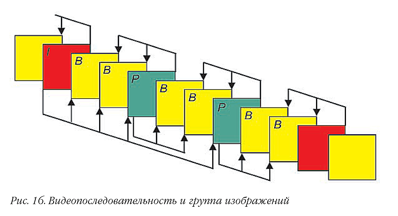 В качестве простейшего предсказателя можно использовать па мять на кадр. Но предсказание не осуществляется путем задержки на кадр входного сигнала изображения, получаемого непосредственно от источника. Это связано с тем, что предсказание должно выполняться и в декодере, которому уже недоступны изображения источника. Восстанавливаемые в декодере изображения, которые только и могут использоваться для предсказания, прошли процедуру квантования в процессе внутрикадрового кодирования и, следовательно, претерпели некоторые необратимые изменения. Поэтому в кодере выполняется обратное квантование и обратное дискретное косинусное преобразование, благодаря чему блок изображения реконструируется так же, как и в декодере. В декодере выполняется обратное квантование, обратное ДКП, в результате чего формируется ошибка предсказания. Она складывается с декодированным изображением предыдущего кадра, образуя декодированное изображение текущего кадра. В соответствии с возможными методами предсказания в системах компрессии с сокращением временной избыточности используются три типа изображений. Изображения типа I (Intra) кодируются независимо от других изображений. В них сокращается только пространственная избыточность. Изображения типа P (Predicted) кодируются с предсказанием на основе предыдущего изображения типа I. Они сами также могут использоваться в качестве опорных для дальнейшего предсказания. В них сокращается и пространственная, и временная избыточность. Изображения типа B (Bi-predicted) кодируются путем двунаправленного предсказания на основе предыдущего и последующего изображений. В них сокращается и пространственная, и временная избыточность и достигается самая большая степень компрессии, поскольку двунаправленное предсказание является наиболее точным. При фиксирован ном уровне качества P-изображение меньше I-изображения в среднем в 3 раза, а B-изображение– примерно в 4 раза. Изображения различных типов объединяются в повторяющиеся серии, называемые группами изображений (рис. 16). Группа начинается с изображения типа I, образующего опорный сигнал для предсказания при кодировании изображений других типов. Группа изображений должна быть достаточно большой, если необходимо добиться высокой степени компрессии.