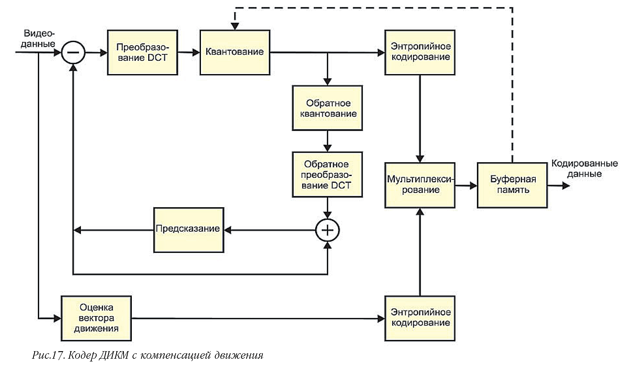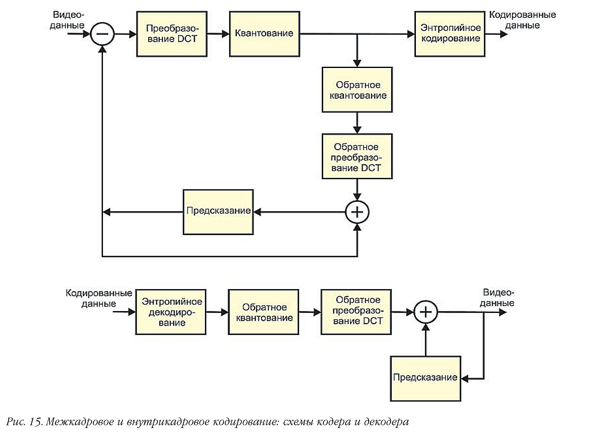 Цель межкадрового кодирования — сокращение временной избыточности телевизионных изображений, вызванной сильными корреляционными связями между соседними кадрами. Поскольку изображения двух соседних кадров очень похожи, скорость цифрового потока можно сократить, предсказывая текущий кадр на основе предыдущего и передавая лишь разницу между действительным и предсказанным изображением текущего кадра, что было отмечено в первой части данной статьи (Часть 1 рис. 5). Соединение межкадрового и внутрикадрового кодирования приводит к схеме, в которой кодирование складывается из следующих основных этапов: дифференциальная импульсно-кодовая модуляция (ДИКМ), декорреляция на основе унитарного преобразования, квантование коэффициентов преобразования, энтропийное кодирование (рис. 15). В кодере вычисляется ошибка предсказания, то есть разность между фактическим и предсказанным блоками изображения, что сокращает временную избыточность. Ошибка предсказания подвергается ДКП, квантуется и кодируется в энтропийном кодере с переменной длиной слова. Такой процесс уменьшает и временную, и пространственную, и психофизическую избыточность.