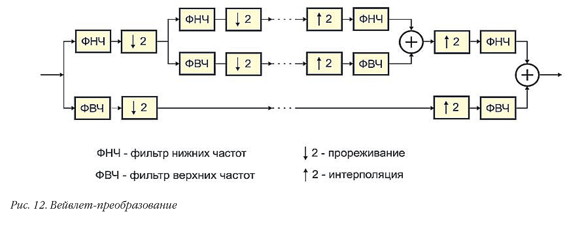 В качестве унитарного преобразования в системах видеокомпрессии может использоваться вейвлет-преобразование [2]. Вейвлет-преобразование (ВП) можно рассматривать как представление сигнала в виде суперпозиции некоторых базисных функций– волновых пакетов (Wavelet– маленькая волна). Особенностью этих волновых пакетов является то, что все они получены из одной прототипной волны путем растяжения (или сжатия) и смещения. Прототипная волна может рассматриваться как импульсная реакция базового фильтра. Тогда вей влет-преобразование сводится к совокупности процессов фильтрации и децимации (рис. 12). Преобразуемый сигнал подвергается фильтрации с помощью фильтров нижних и верхних частот, которые делят диапазон частот исходного сигнала на две половины. И низкочастотная, и высокочастотная компоненты сигнала,