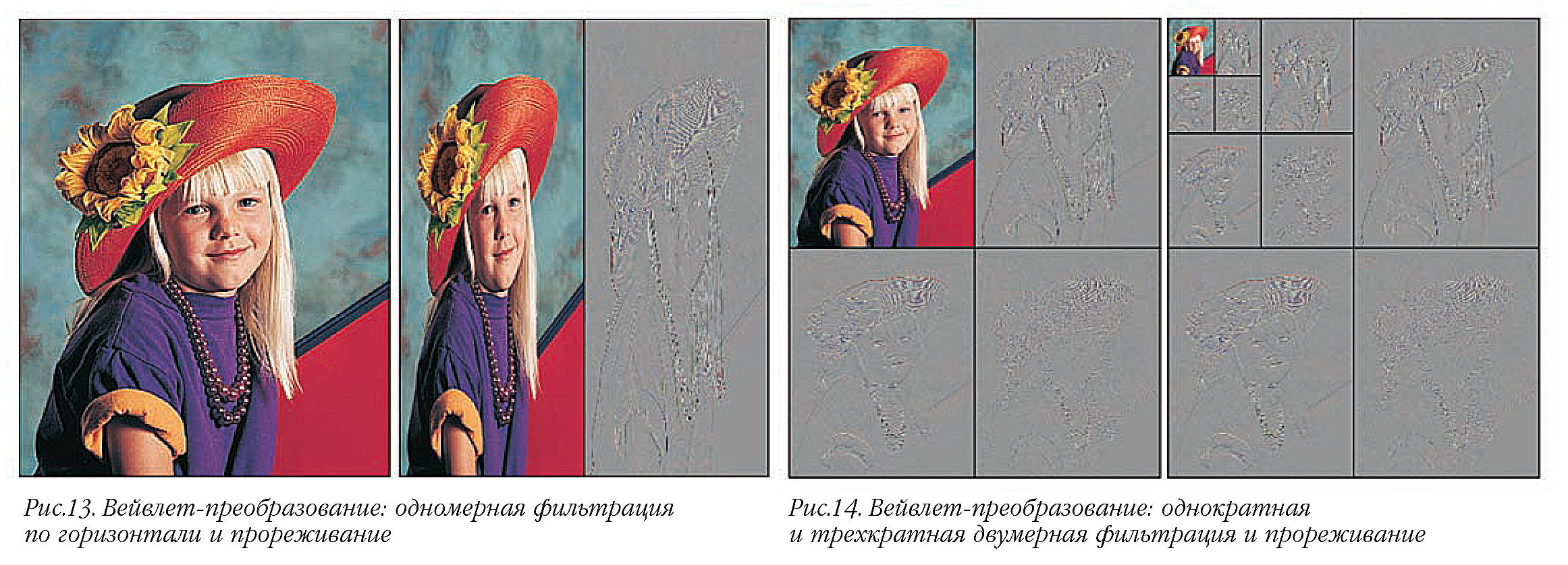 Применение одномерной фильтрации и прореживания в горизонтальном направлении к телевизионному изображению показано на рис. 13. Слева расположено исходное изображение. В левой части правого изображения находится отфильтрованная и прореженная низкочастотная составляющая изображения, в правой — высокочастотная. Поскольку после прореживания число отсчетов в каждой составляющей сокращается в два раза в каждой телевизионной строке, оба компонента размещаются на площади исходного изображения. Как следует из схемы рис. 12, на втором этапе преобразования низкочастотная составляющая вновь разделяется на низкочастотную и высокочастотную компоненты. После прореживания низкочастотная компонента может подвергнуться дальнейшему разделению на третьем этапе. Результаты трехкратной двумерной фильтрации и прореживания изображения показаны на правой картинке рис. 14. После каждого из трех этапов изображение делится на одну низкочастотную и три высокочастотные компоненты. На каждом этапе изображение сначала фильтруется и прореживается по горизонтали (результат фильтрации — правое изображение рис. 13), затем полученные две компоненты фильтруются с помощью фильтров нижних и верхних вертикальных пространственных частот и прореживаются по вертикали (левая картинка рис. 14). Из трех высокочастотных компонент одна отображает высокочастотную составляющую исходного изображения, полученную путем последовательного применения фильтра верхних горизонтальных пространственных частот и фильтра нижних вертикальных пространственных частот. Эта компонента располагается в правом верхнем углу комбинированного изображения (см. левую картинку рис. 14), на ней заметны вертикальные границы яркостных переходов и вертикальные линии. Вторая высокочастотная компонента отображает вертикальные составляющие (горизонтальные яркостные переходы и горизонтальные линии). Она располагается в левом нижнем углу левого изображения рис. 14. В правом нижнем углу левого изображения рис. 14 располагается третья высокочастотная компонента, связанная с диагональными пространственными частотами и отображающая диагональные яркостные переходы в исходном изображении. После трех этапов изображение разделилось на одну низкочастотную и девять высокочастотных компонент с разными пространственными частотами и различными разрешениями (полосами частот). Следует обратить внимание на то, что после третьего этапа четкость низкочастотной компоненты, располагающейся в верхнем левом углу правой картинки рис. 14, стала в 8 раз меньше четкости исходного изображения (полоса частот каждой компоненты, полученной на третьем этапе, равна 1/8 от полосы исходного сигнала). На стадии обратного вейвлет-преобразования каждая компонента преобразованного сигнала сначала растягивается в два раза, то есть после каждого отсчета вставляется дополнительный нулевой отсчет (рис. 12). Растянутая компонента подвергается фильтрации, в результате которой на место нулевых отсчетов помещаются интерполированные величины. Собственно видеокомпрессия на базе вейвлет-преобразования осуществляется так же, как и компрессия на базе дискретного косинусного преобразования. Компоненты видеосигнала, полученного после вейвлет-преобразования, подвергаются квантованию и энтропийному кодированию (с
