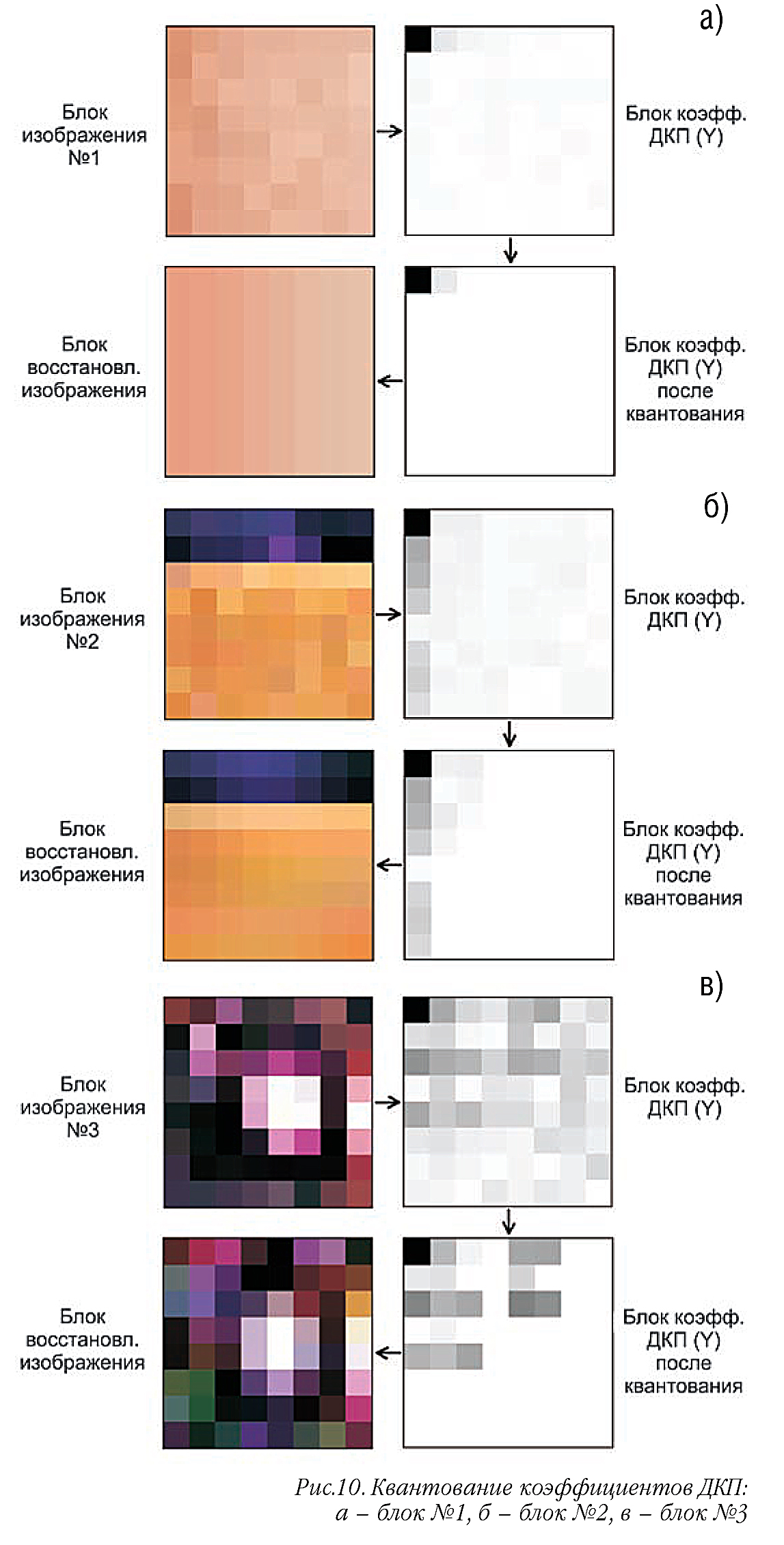 Распределение числа уровней квантования, определяемое матрицей квантования, подчинено цели снижения визуальной заметности возникающих шумов квантования. Грубое квантование высокочастотных коэффициентов дискретного косинусного преобразования (ДКП) при относительно точном квантовании низкочастотных коэффициентов приводит к тому, что основная доля шумов квантования сосредотачивается в высокочастотных составляющих изображения — в областях с мелкозернистой структурой и в окрестностях перепадов яркости. Однако глаз человека хорошо воспринимает шумы квантования на участках с плавными изменениями яркости, где они проявляются в виде ложных контуров. В окрестностях резких перепадов и на фоне мелких деталей такие шумы заметны гораздо меньше. Таким образом, квантование коэффициентов ДКП можно рассматривать как метод компрессии, достигаемый за счет устранения психофизической избыточности описания изображения. В процессе кодирования из изображения удаляются детали, невидимые для глаза, и вводятся искажения, которые практически незаметны визуально. При значительном квантовании (что характерно для высокой степени компрессии) шумы становятся более заметными. Примеры таких искажений, возникающих при квантовании, иллюстрируются на рис. 10. На нём показаны исходные блоки изображения, блоки коэффициентов ДКП, блоки квантованных коэффициентов ДКП и восстановленные блоки изображения. При квантовании теряются высокочастотные компоненты с малыми амплитудами, что приводит к "плоским" изображениям в одних блоках (блок №1, рис. 10а) или к искажению мелких деталей и контуров в других (блок №3, рис. 10в). Искажения от квантования необратимы, но для человеческого глаза они могут быть малозаметны, если степень компрессии не чрезмерна.