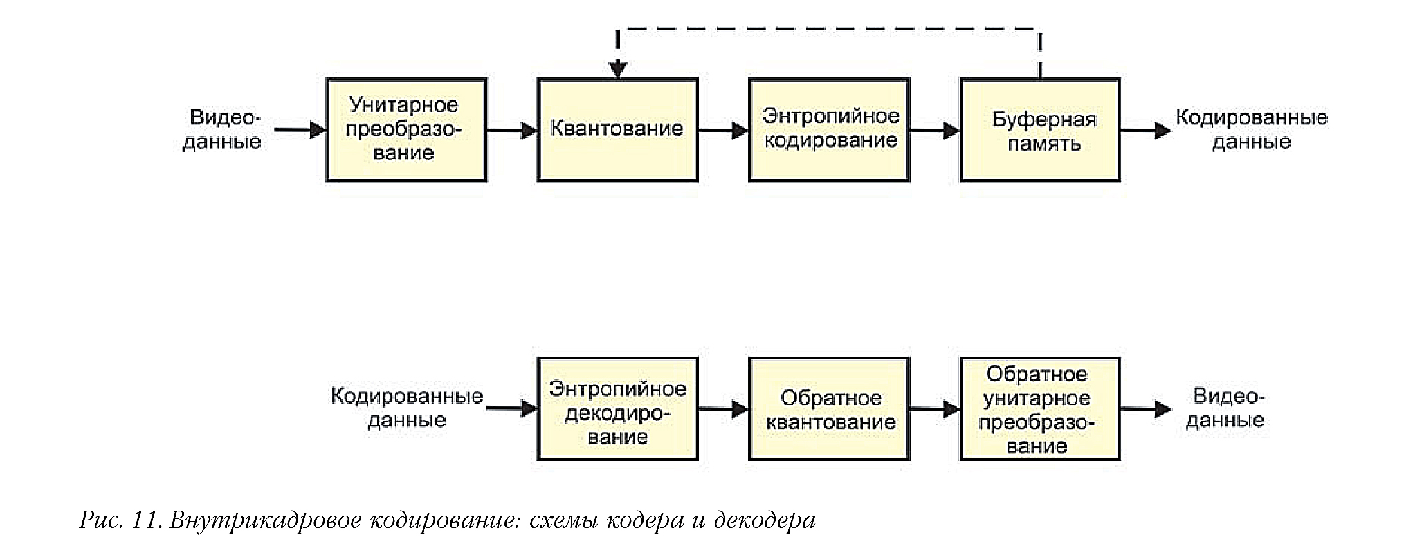 Схемы, иллюстрирующие в упрощённой форме внутрикадровое кодирование и декодирование на базе унитарных преобразований (в предыдущих рассуждениях в качестве унитарного преобразования рассматривалась дискретное косинусное преобразование), показаны на рис. 11. Они демонстрируют последовательность основных операций внутрикадрового кодирования при видеокомпрессии: дискретное косинусное преобразование, квантование и энтропийное кодирование. Кодер может работать в двух режимах. Первый предполагает кодирование с постоянным уровнем качества восстанавливаемого изображения, достигаемым за счёт фиксированной матрицы квантования коэффициентов ДКП. Однако, как следует из вышеприведённых рассуждений, это приводит к переменной скорости потока данных на выходе энтропийного кодера (или кодера с переменной длиной слова). Скорость возрастает при увеличении уровня высокочастотных компонентов изображения (пример — блок на рис. 10а) и снижается при передаче изображений с низкой детализацией (например, блок 1 на рис. 8 из первой части статьи, где символ "конец блока" заменяет большинство нулевых коэффициентов после квантования). Этот режим подходит для профессиональных приложений, где требуется дальнейшая обработка изображения с высоким качеством, без строгих ограничений на скорость передачи данных и объём памяти.