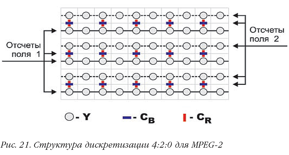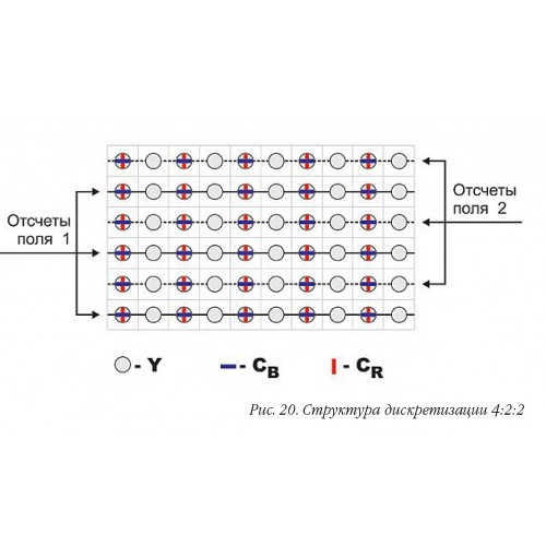 В формате 4:2:2 частота дискретизации цветоразностных компонентов снижается вдвое, что приводит к уменьшению цветового разрешения по горизонтали также в два раза (рис. 20). Такое снижение допустимо благодаря особенностям человеческого зрения, которое менее чувствительно к мелким цветовым деталям. Этот подход применяется в аналоговом телевидении, где полоса частот цветоразностных сигналов значительно уже полосы яркостного сигнала. В цифровом телевидении субдискретизация 4:2:2 можно рассматривать как форму сжатия с коэффициентом 3:2 = 1,5:1.