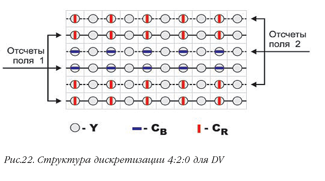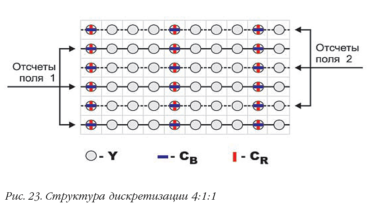 Дальнейшее снижение скорости цифрового видеопотока достигается переходом к субдискретизации 4:2:0, при которой цветовое разрешение уменьшается вдвое как по горизонтали, так и по вертикали по сравнению с 4:4:4. Субдискретизация 4:2:0, используемая в системе сжатия MPEG-2, показана на рис. 21, а вариант для системы DV — на рис. 22. Преимущество заключается в двукратном сокращении скорости видеопотока. Аналогичное уменьшение объема данных (вдвое) происходит и при субдискретизации 4:1:1 (рис. 23), где частота дискретизации цветоразностных компонентов снижается в четыре раза, что приводит к четырехкратному уменьшению цветовой четкости по горизонтали по сравнению с 4:4:4. Таким образом, субдискретизации 4:2:0 и 4:1:1 обеспечивают сжатие с коэффициентом 2:1.