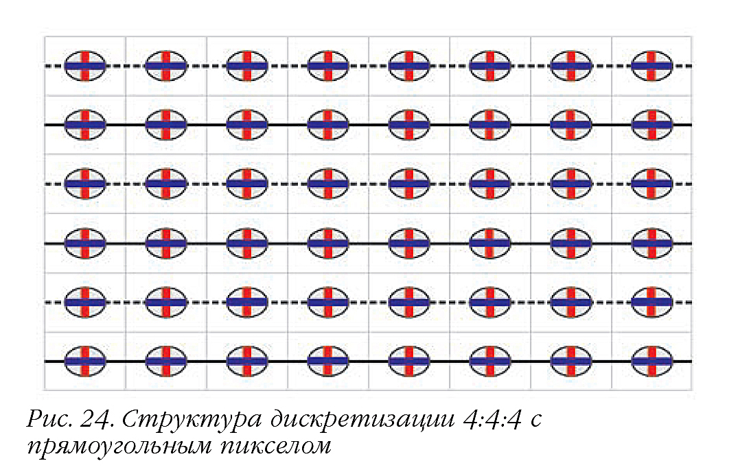 Стандарты цифрового телевидения высокой четкости предусматривают использование квадратных пикселей, обеспечивающих равное пространственное разрешение по горизонтали и вертикали. Однако для снижения скорости видеопотока может применяться уменьшение горизонтального разрешения путем введения прямоугольного пикселя для яркостной составляющей изображения (рис. 24). Например, в формате с 1080 активными строками пиксель может удлиниться по горизонтали, принимая соотношение сторон 4:3. При этом число пикселей в активной части строки снижается с 1920 до 1440, что уменьшает скорость видеопотока. Использование прямоугольного пикселя здесь эквивалентно сжатию с коэффициентом 4:3 = 1,33:1.