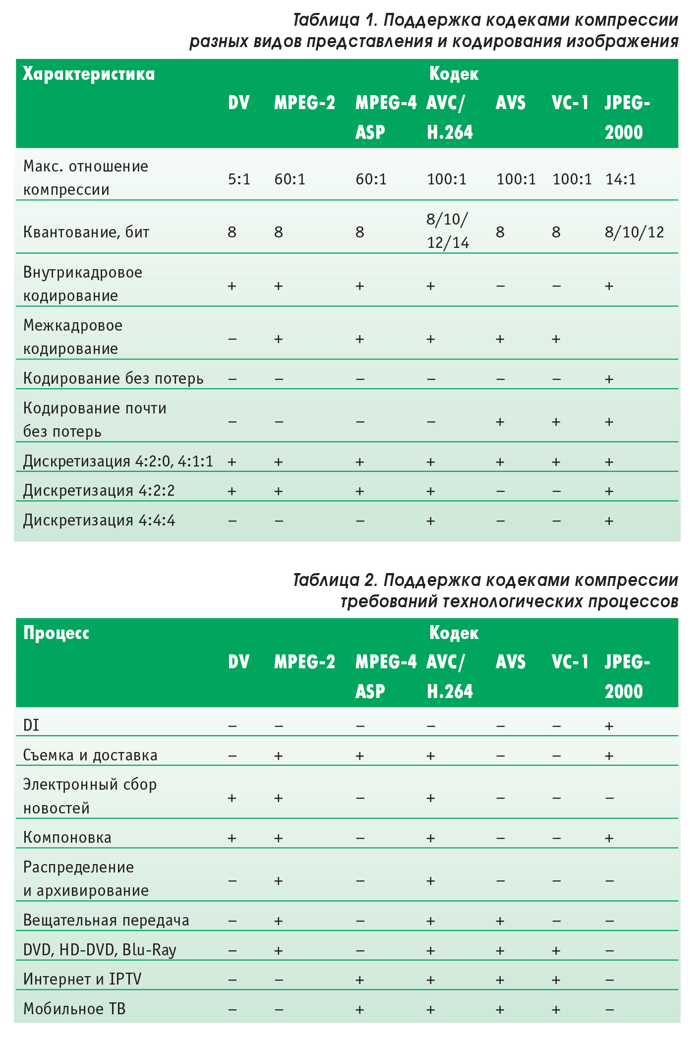 Данные о поддержке различных форматов изображений и типов кодирования в кодеках систем видеокомпрессии (DV, MPEG-2, MPEG-4 ASP, AVC, H.264, AVS, VC-1, JPEG2000) приведены в табл. 1. Сопоставляя параметры систем с требованиями процессов, можно определить области применения кодеков (табл. 2). Как видно, все системы подходят для нескольких процессов. Нет универсальной системы для всего цифрового телевидения и кинематографа, но кодеки H.264/AVC имеют наиболее широкий спектр применения.
